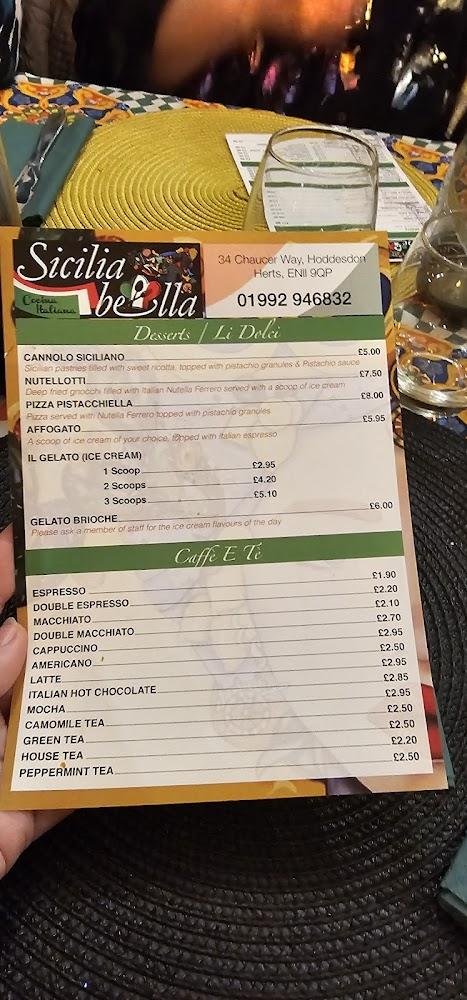 Situated at 34 Chaucer Way, Hoddesdon, EN11 9QP, Sicilia Bella boasts a cozy and casual vibe ideal for families and groups alike. The restaurant embraces diners with its warm atmosphere, making any meal feel special. Accessibility is prioritized here, as the restaurant is wheelchair-friendly with accessible seating and facilities. They offer various service options, including dine-in, takeaway, kerbside pickup, and delivery, making it easy to enjoy your favorite Italian dishes, no matter your circumstances. The restaurant operates daily, welcoming guests for lunch and dinner, and it is advisable to make reservations, especially during peak hours. While the location might seem unassuming, patrons rave about the delicious food and warm service, proving that great dining experiences can come from unexpected places.